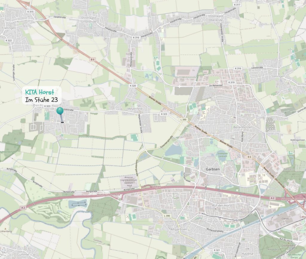 Der Kindergarten befindet sich in Horst, einem Ortsteil von Garbsen. Die dörfliche Struktur bietet verschiedene Nutzungsmöglichkeiten, wie zum Beispiel den Wald, Bauernhöfe, Ortsfeuerwehr, Grundschule, Sportplatz, Einkaufsmöglichkeiten und Ärzte. Durch die Anbindung an das öffentliche Nahverkehrsnetz, sind Ausflüge in die anderen Ortsteile oder auch nach Hannover möglich.